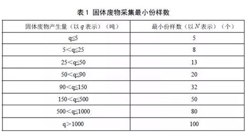 4.2.1危險廢物鑒別需根據待鑒別固體廢物的產生量確定采樣份樣數(第4.2.4條所列情形除外),表1為需要采集的固體廢物的最小份樣數。
