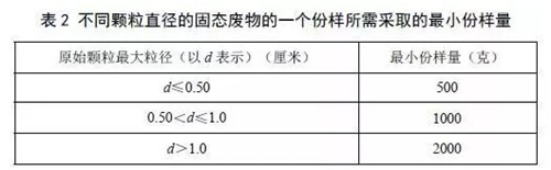 b)依據固態廢物的原始顆粒**粒徑,不小于表2中規定的質量。
